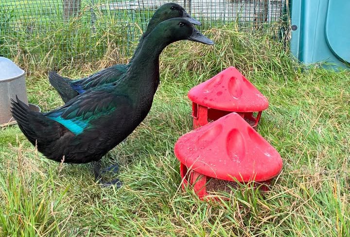 Cayuga ducks, a hardy breed of domestic duck known for their iridescent black plumage.