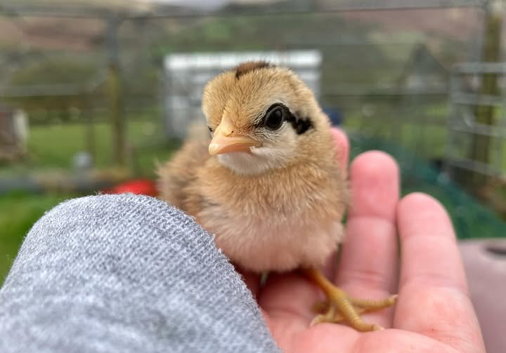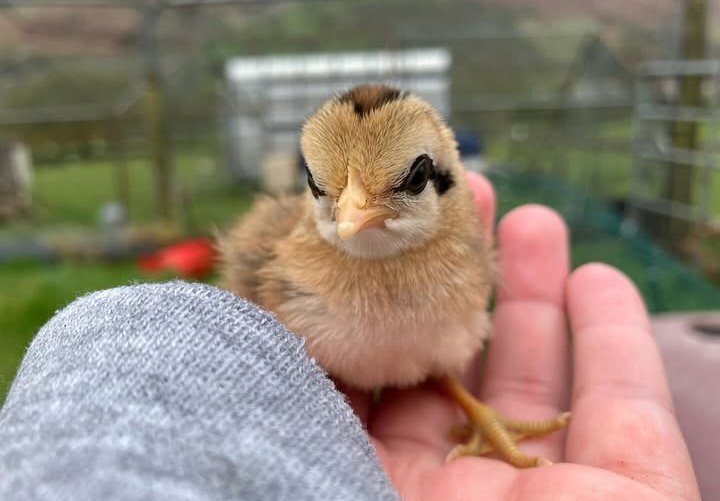 The chick appears to have a single comb and potentially some feathering on its legs, which are features of certain bantam breeds.